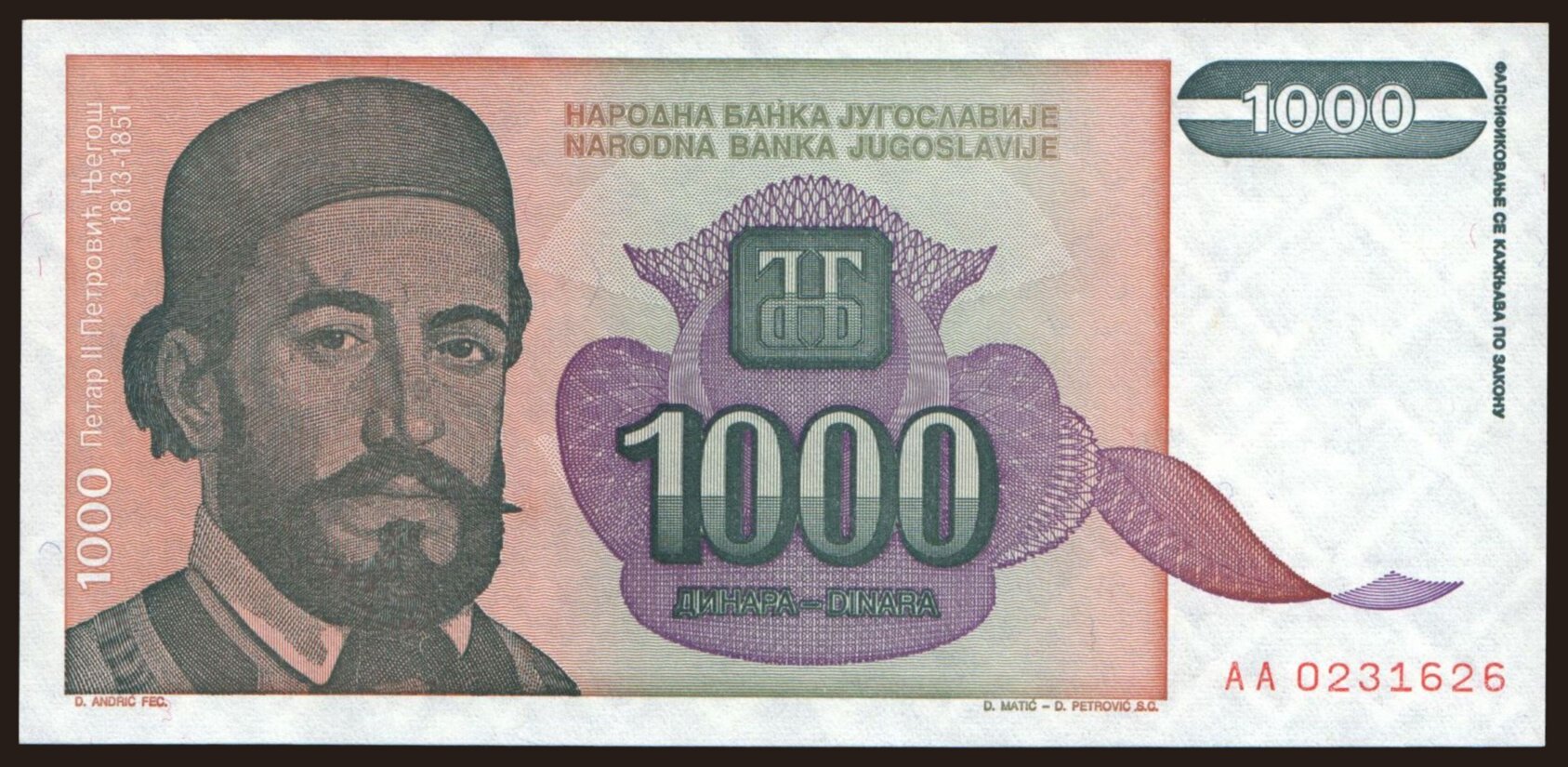1000 dinara, 1992