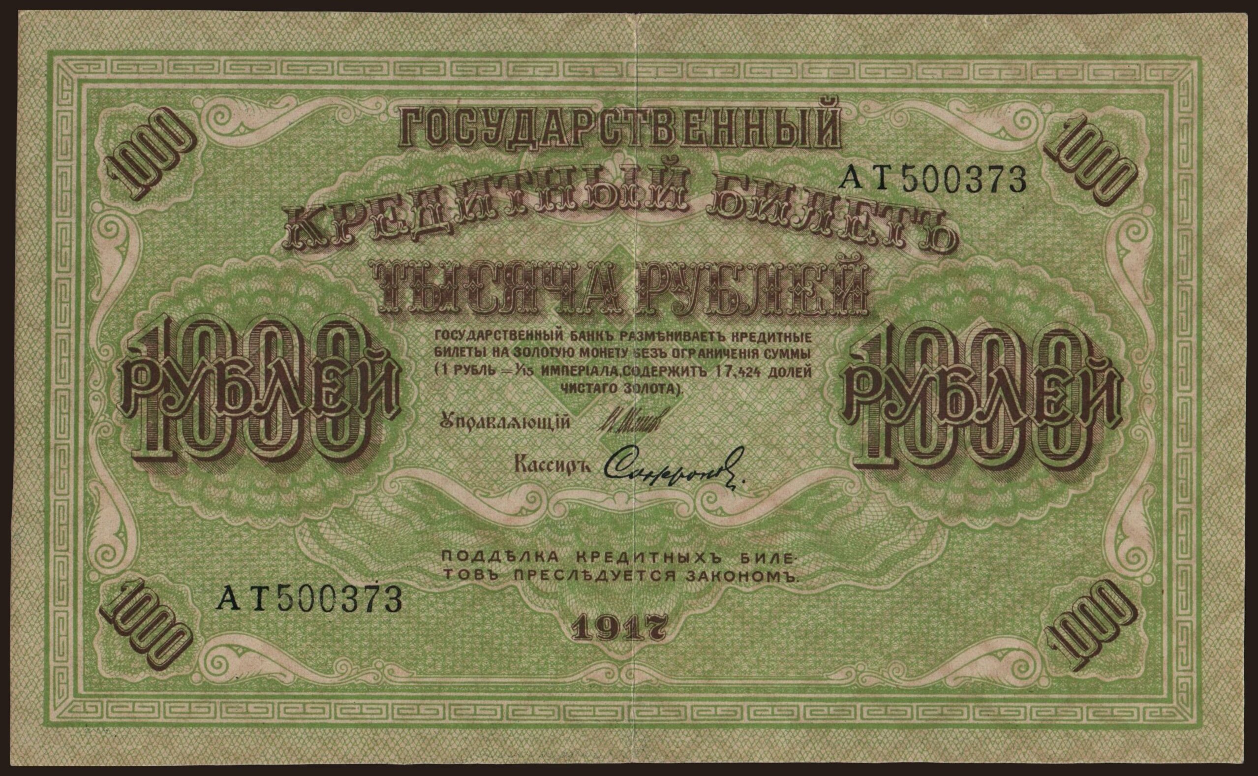 1000 rubel, 1917, Shipov/ F. Schmidt, falsum