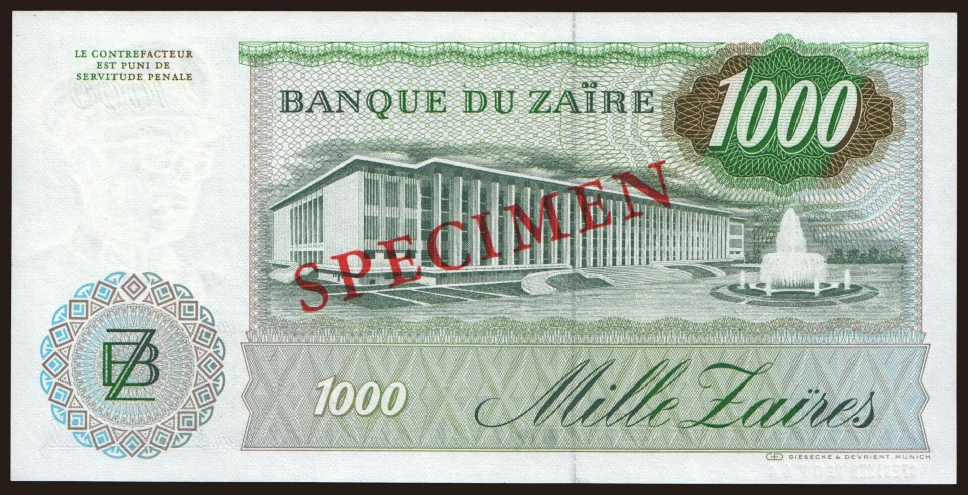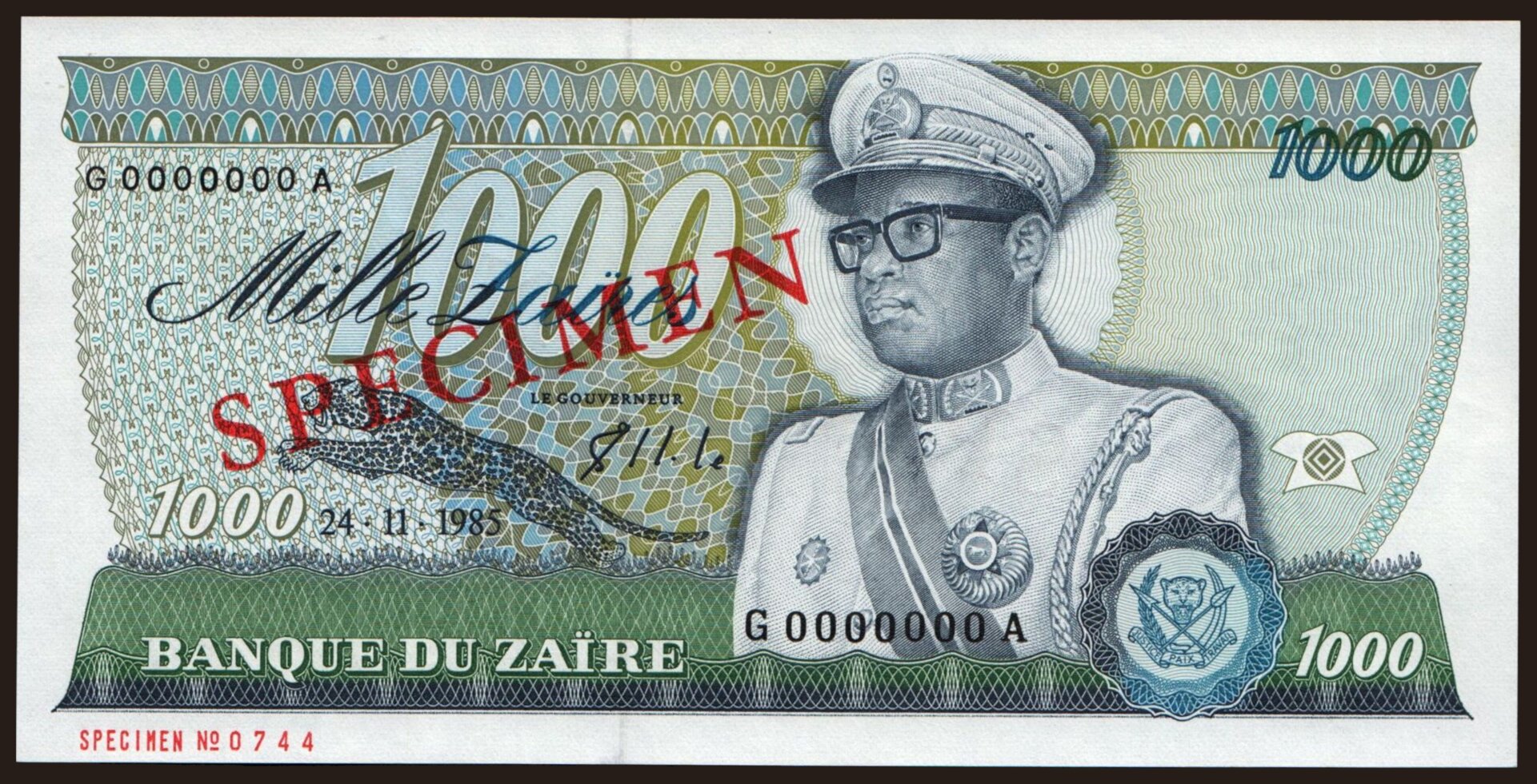 1000 zaires, 1985, SPECIMEN