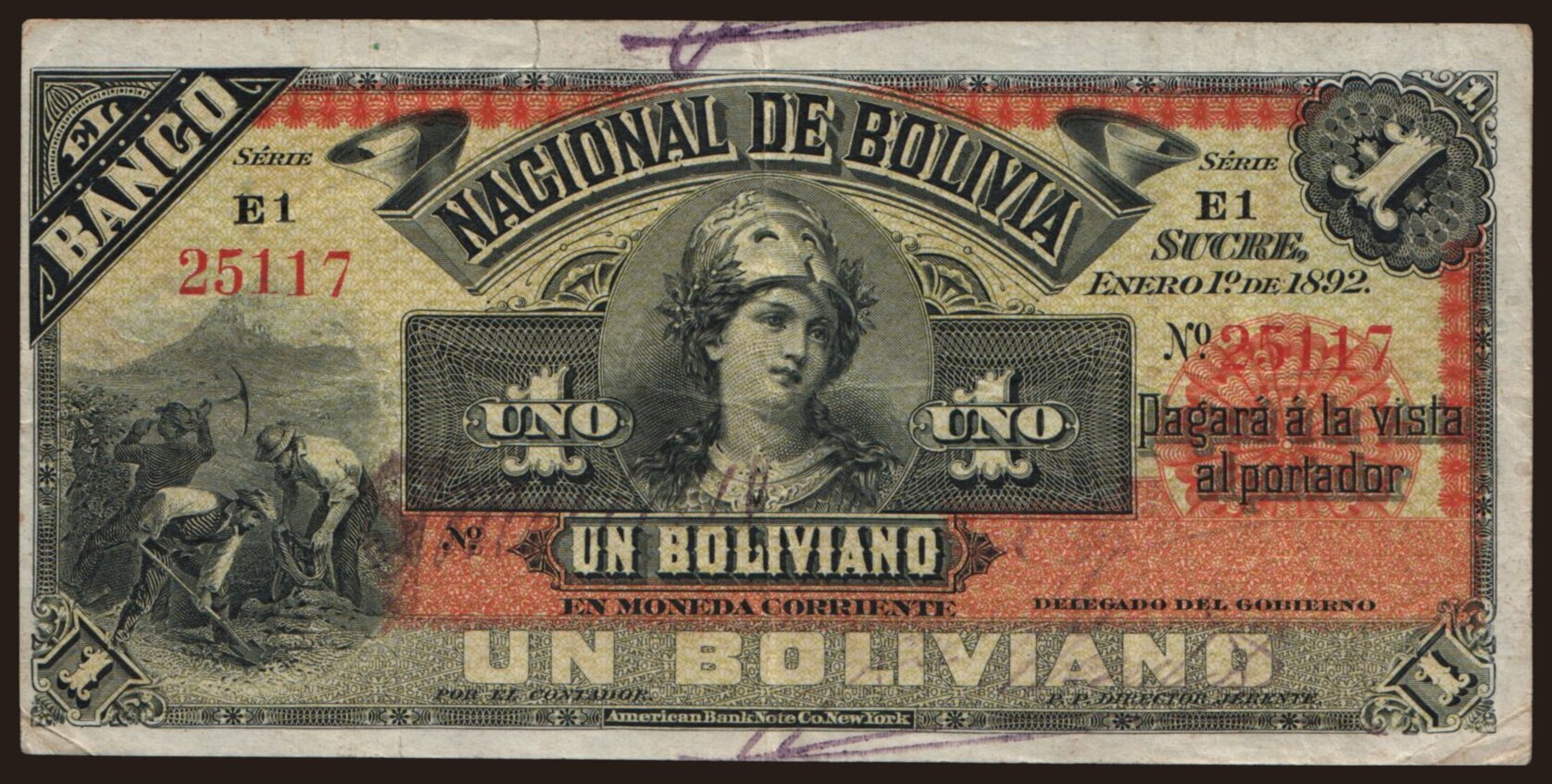 Banco Nacional De Bolivia, 1 boliviano, 1892