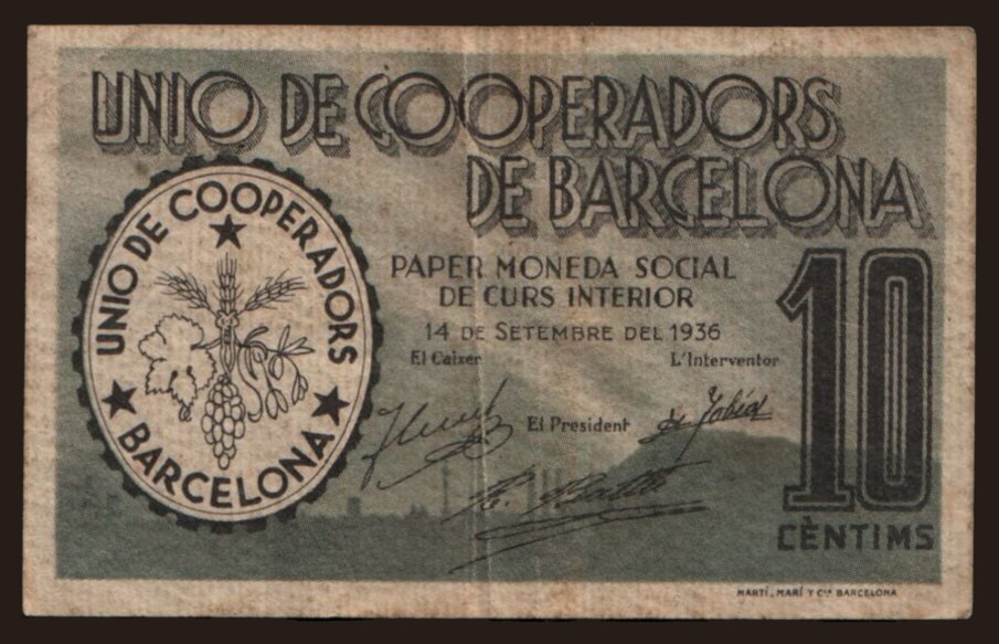Barcelona/ Union de Cooperadors, 10 centimos, 1937