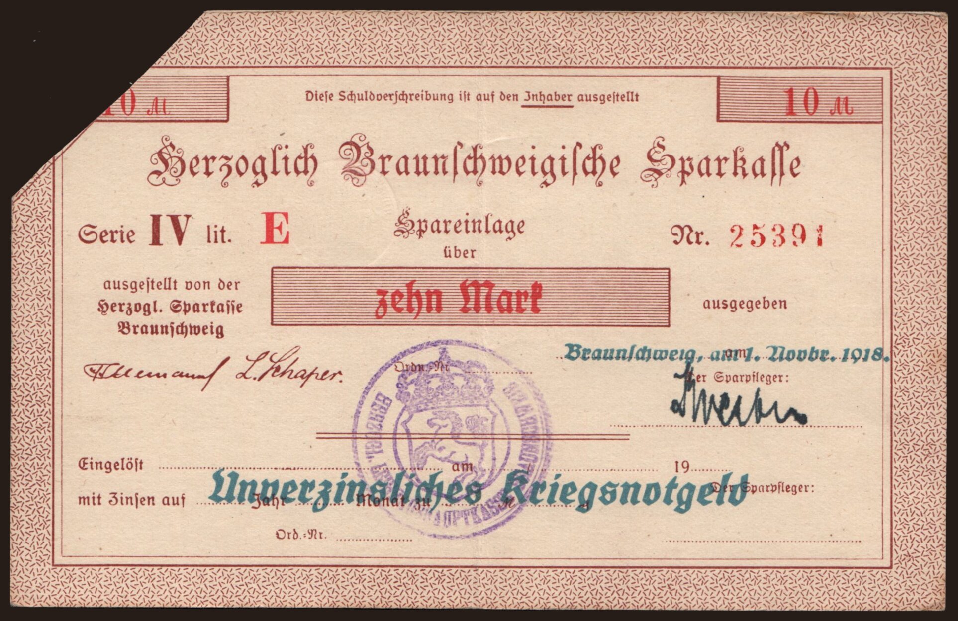 Braunschweig/ Herzoglich Braunschweigische Sparkasse, 10 Mark, 1918