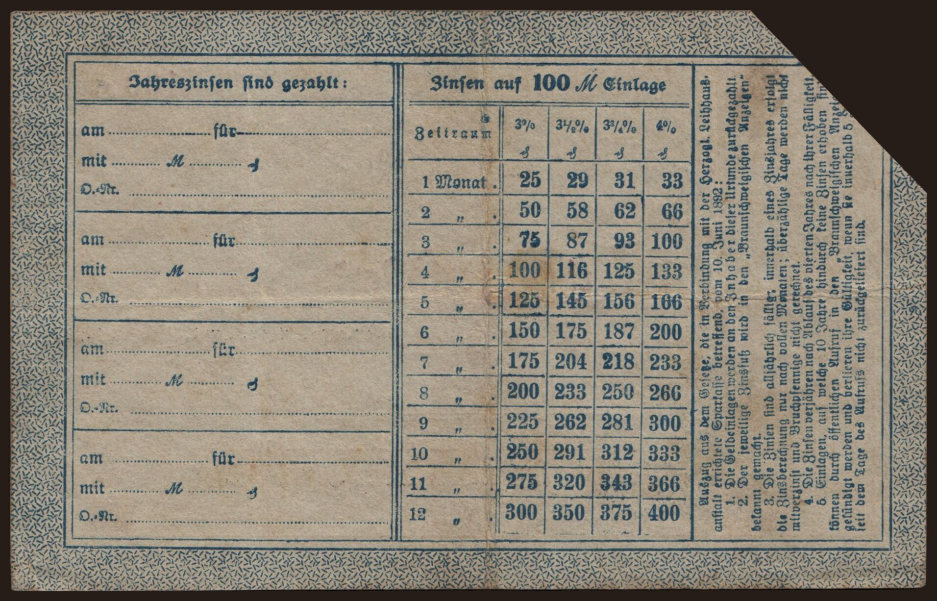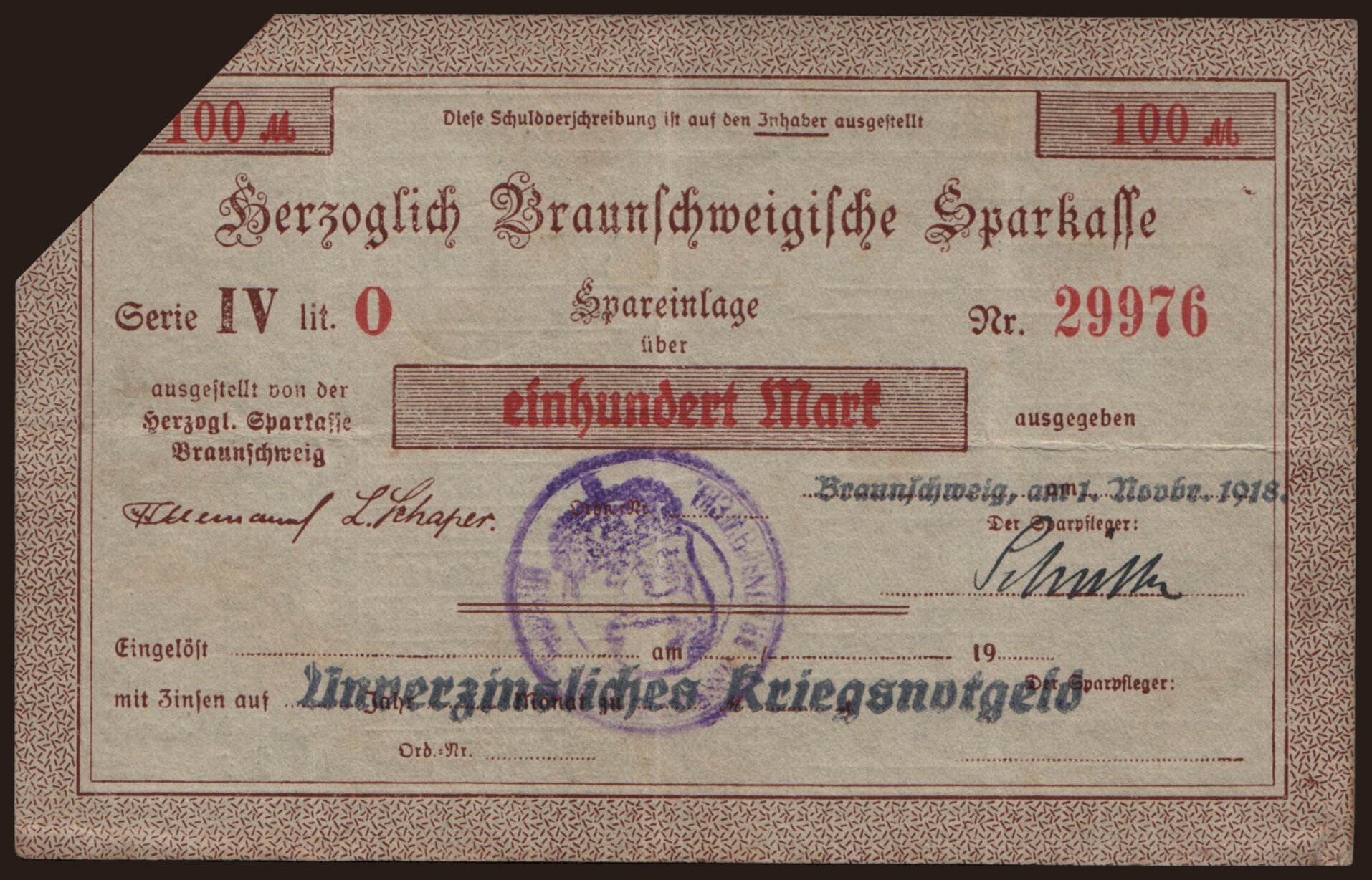 Braunschweig/ Herzoglich Braunschweigische Sparkasse, 100 Mark, 1918