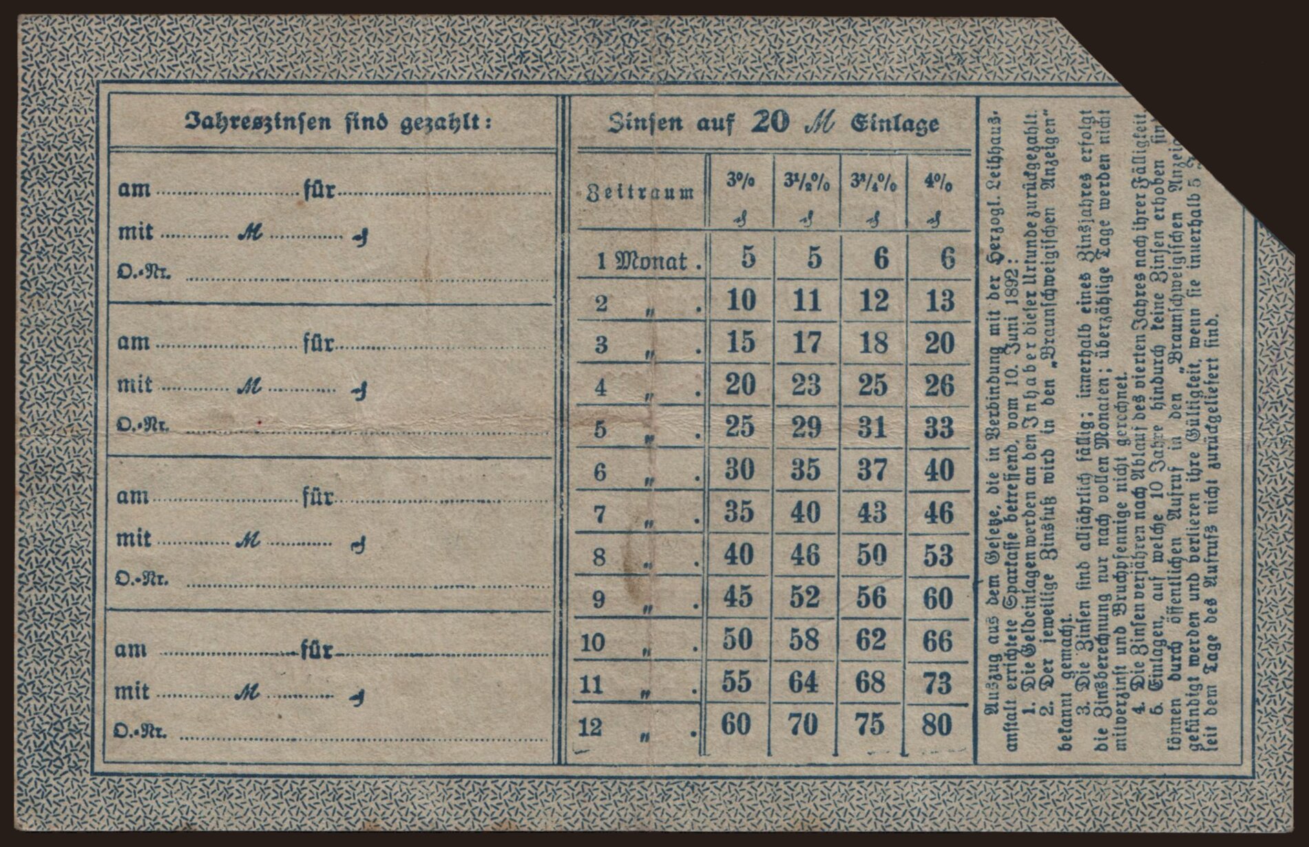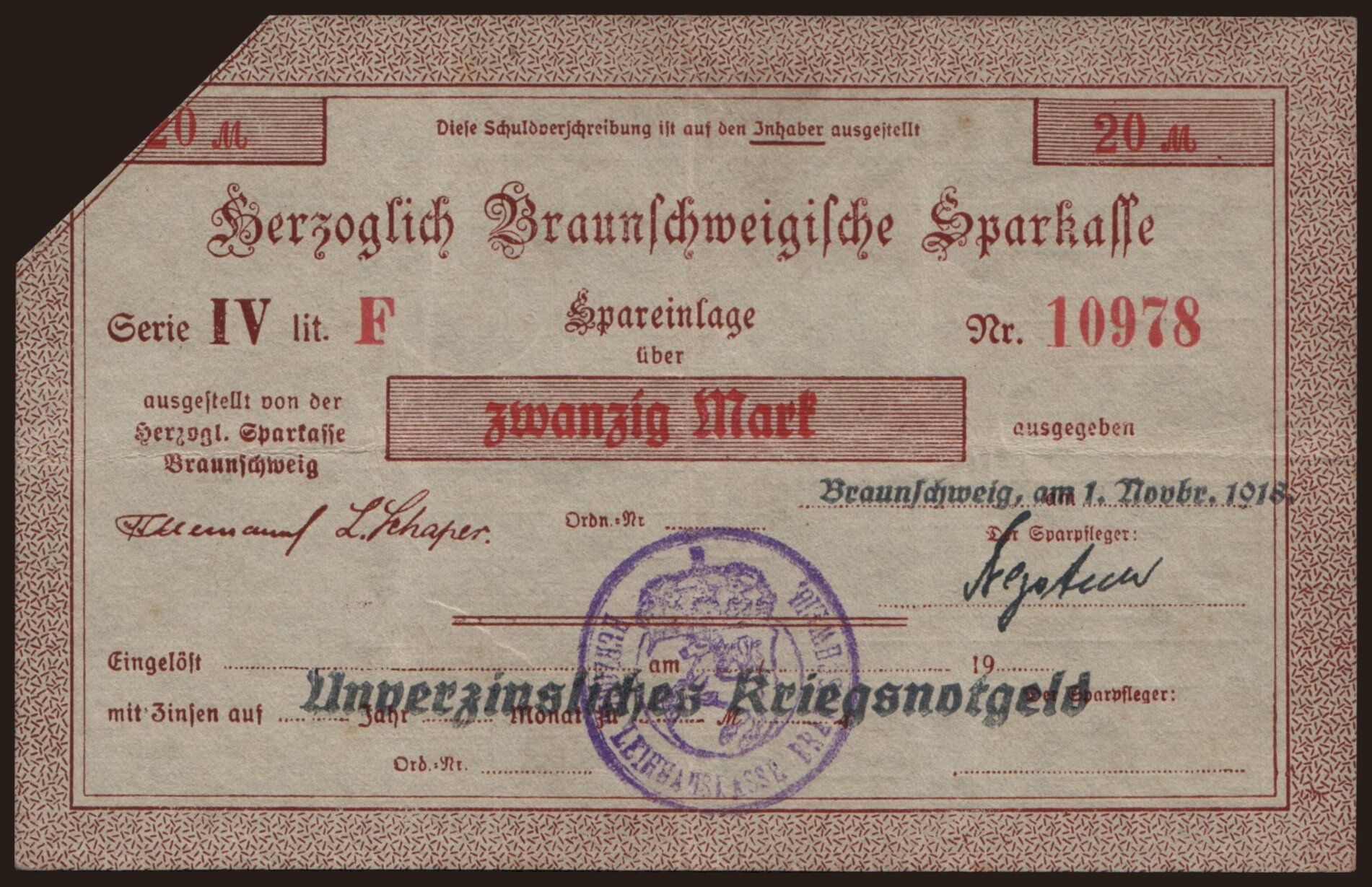 Braunschweig/ Herzoglich Braunschweigische Sparkasse, 20 Mark, 1918