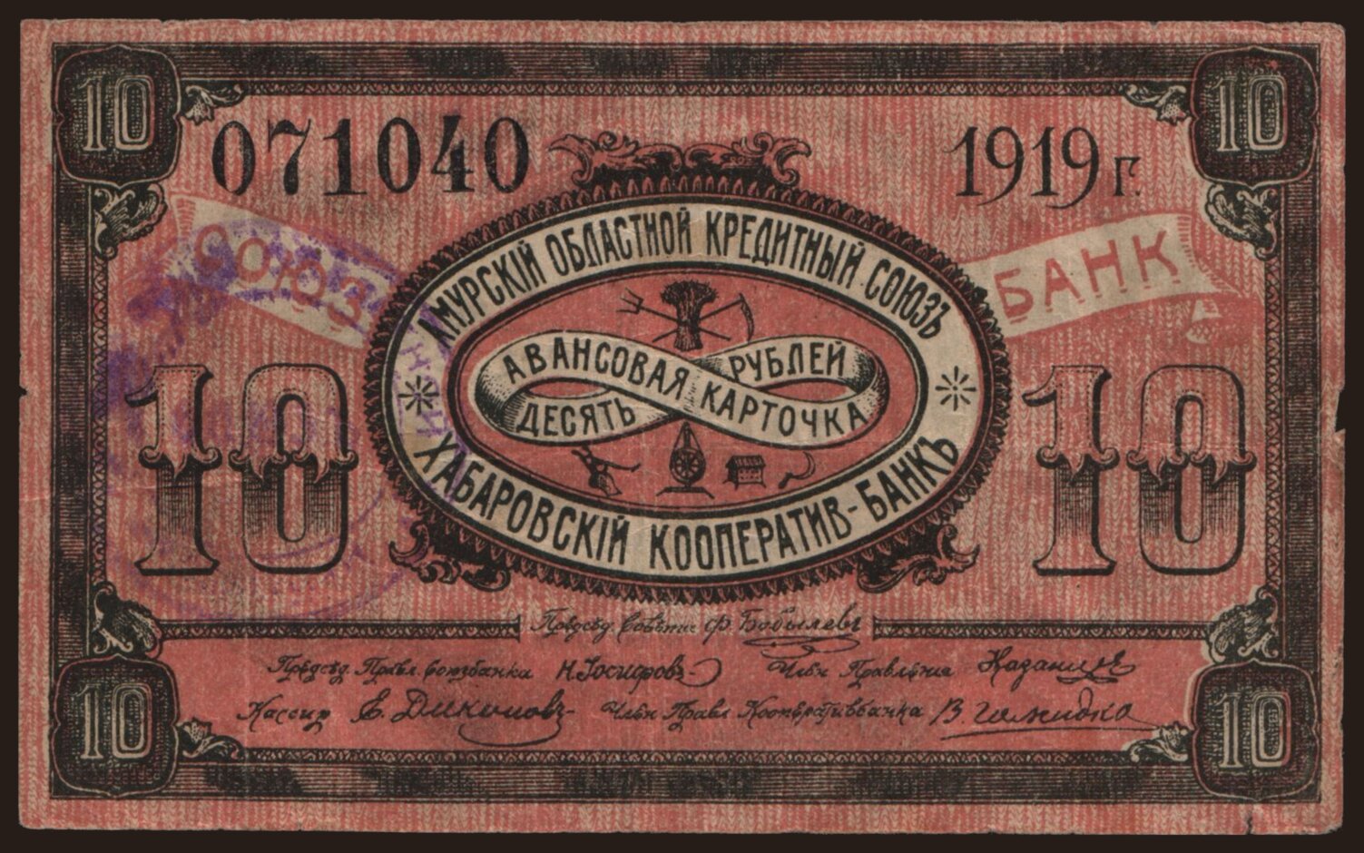 Chabarovsk/ Kooperativ Bank, 10 rubel, 1919