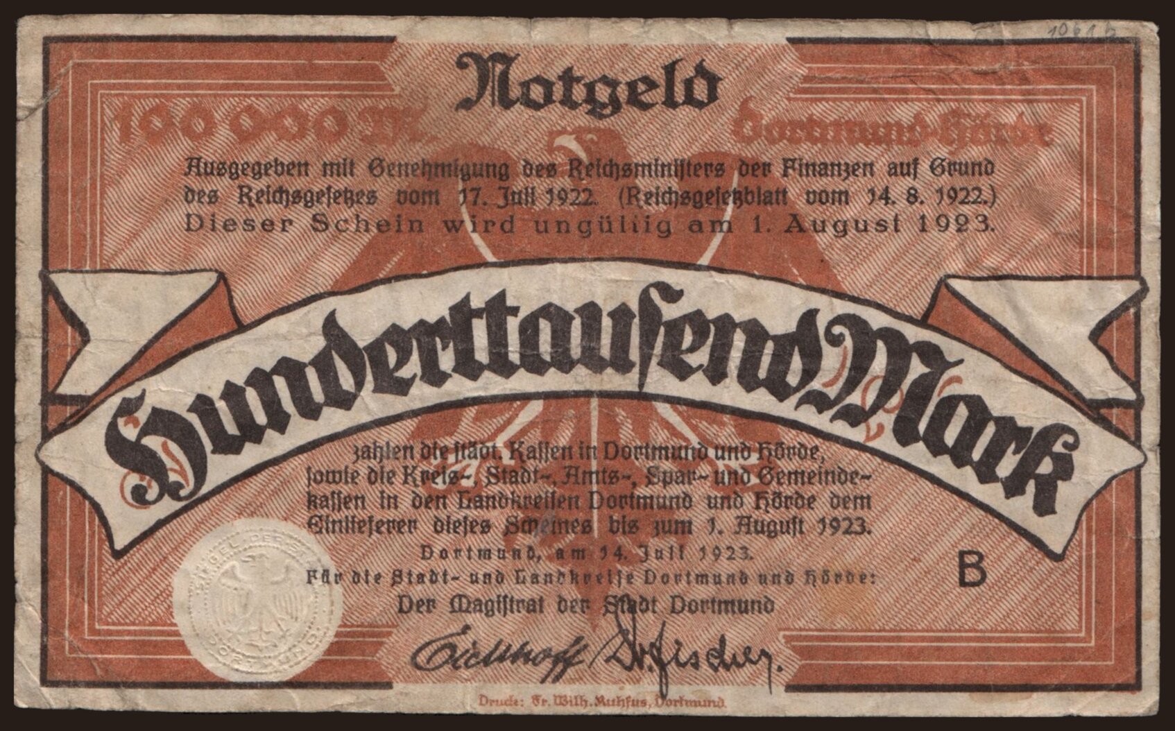 Dortmund-Hörde/ Stadt- und Landkreise, 100.000 Mark, 1923