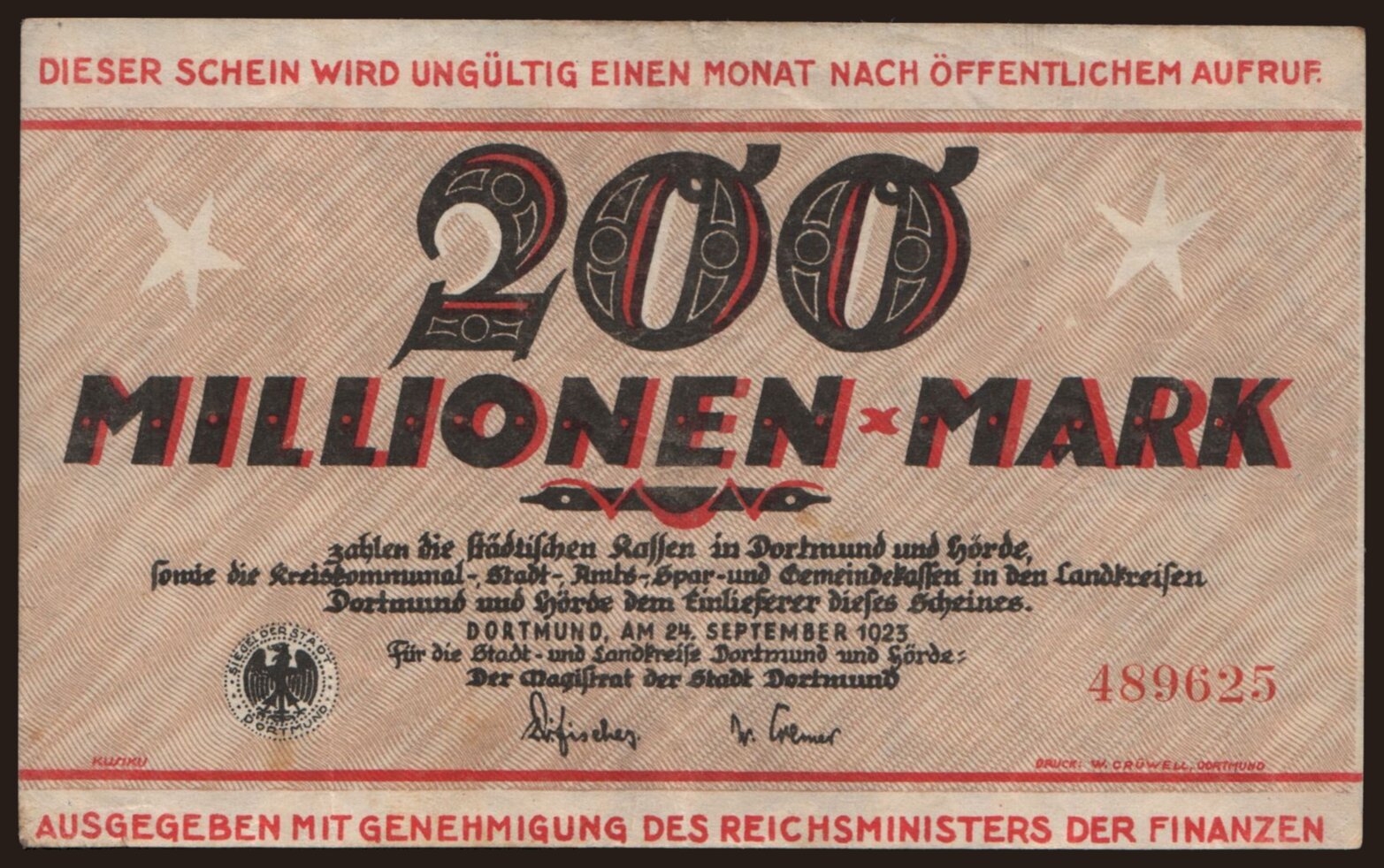 Dortmund/ Magistrat der Stadt, 200.000.000 Mark, 1923
