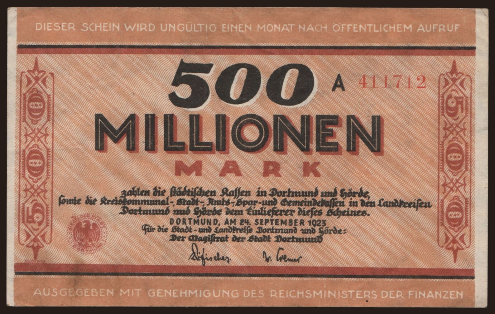 Dortmund/ Magistrat der Stadt, 500.000.000 Mark, 1923
