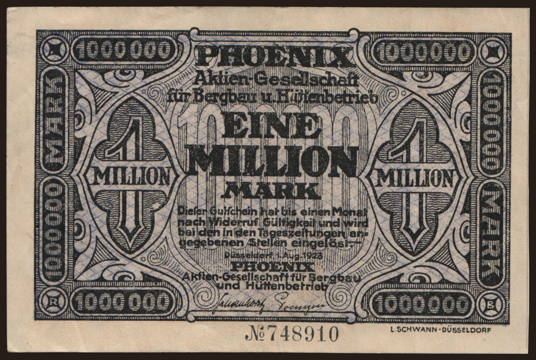 Düsseldorf/ Phoenix A.G. für Bergbau und Hüttenbetrieb, 1.000.000 Mark, 1923