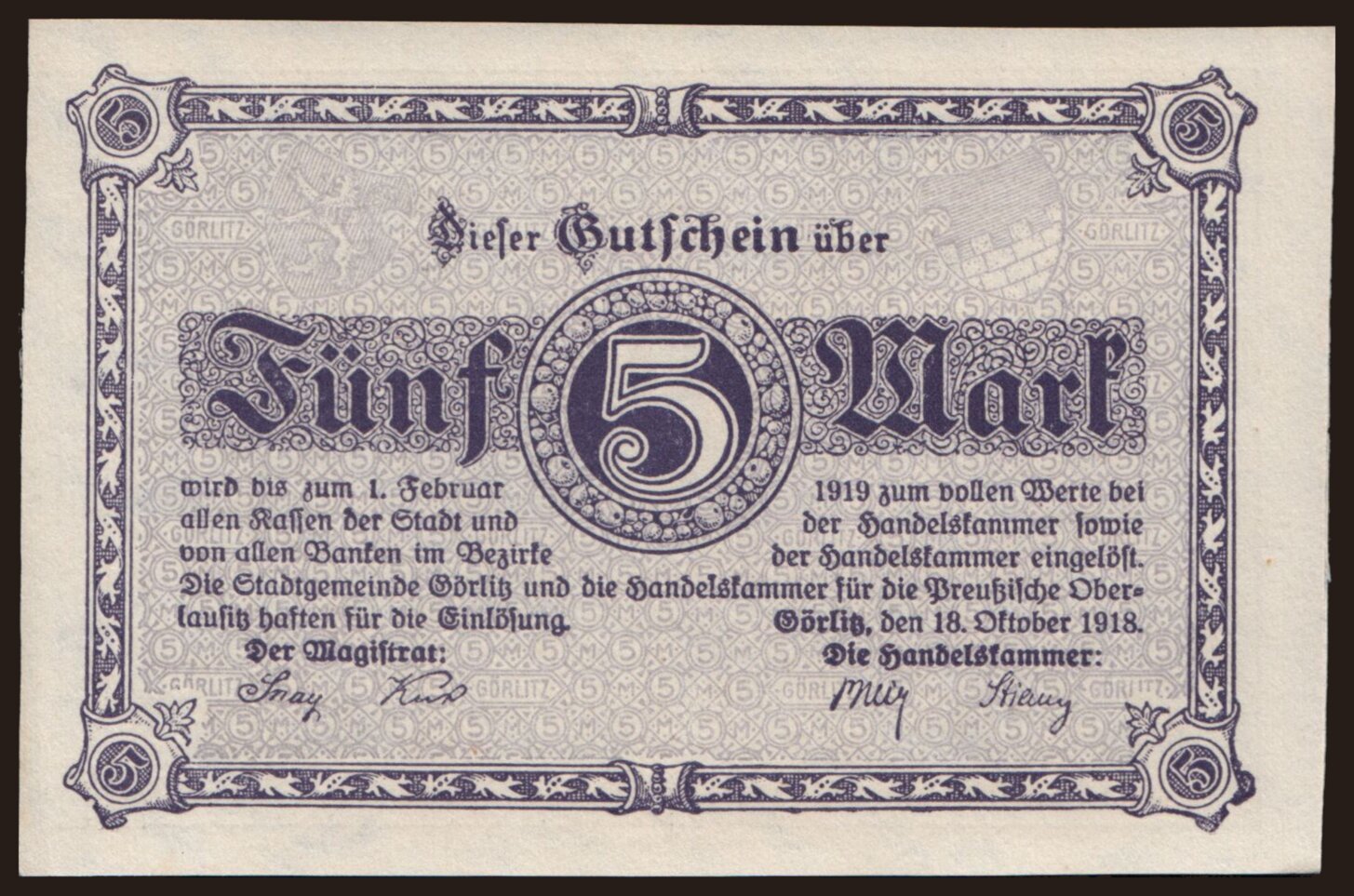 Görlitz/ Stadt und Handelskammer, 5 Mark, 1918