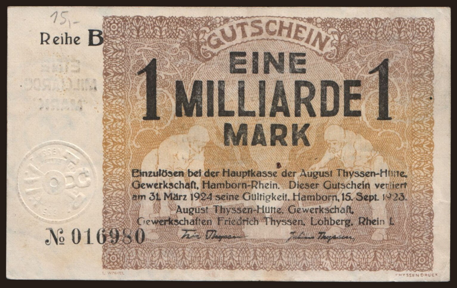 Hamborn/ August Thyssen Hütte, 1.000.000.000 Mark, 1923