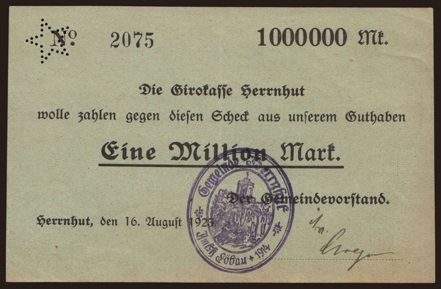 Herrnhut/ Gemeindevorstand, 1.000.000 Mark, 1923
