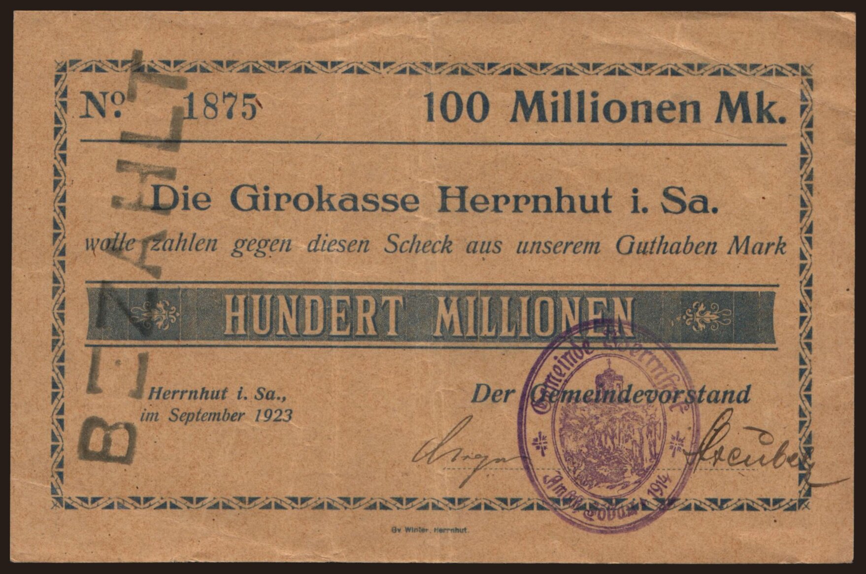 Herrnhut/ Gemeindevorstand, 100.000.000 Mark, 1923