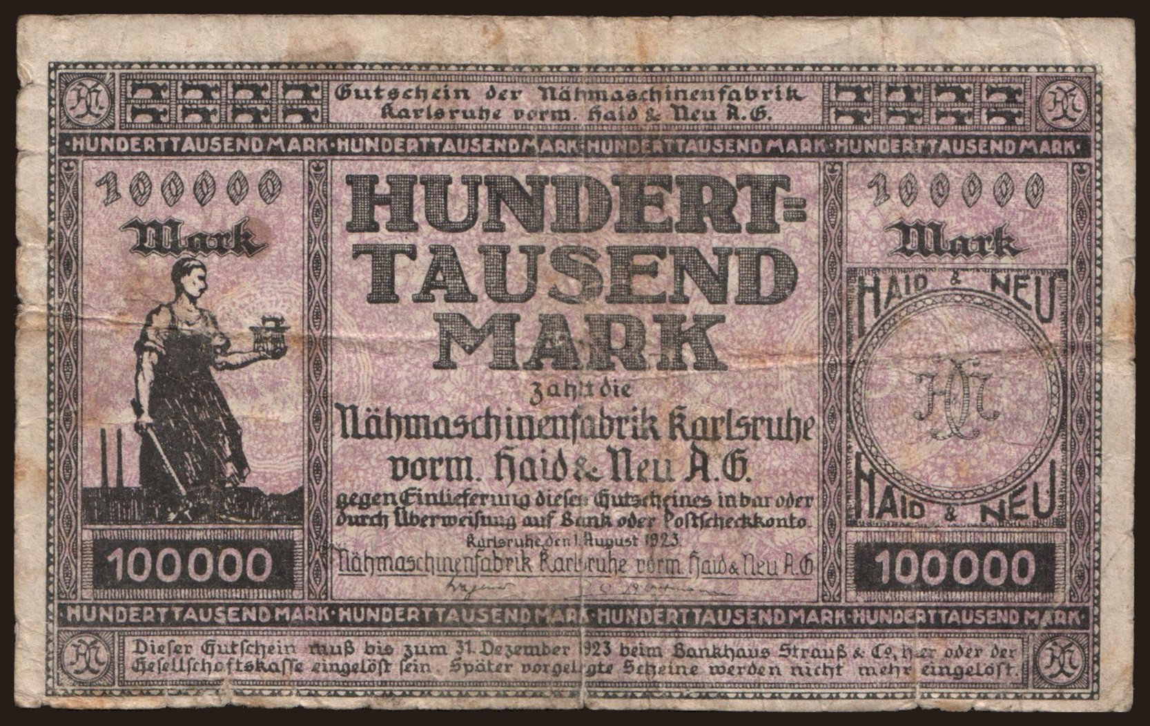 Karlsruhe/ Nähmaschinenfabrik Karlsruhe vorm. Haid & Neu A.G., 100.000 Mark, 1923