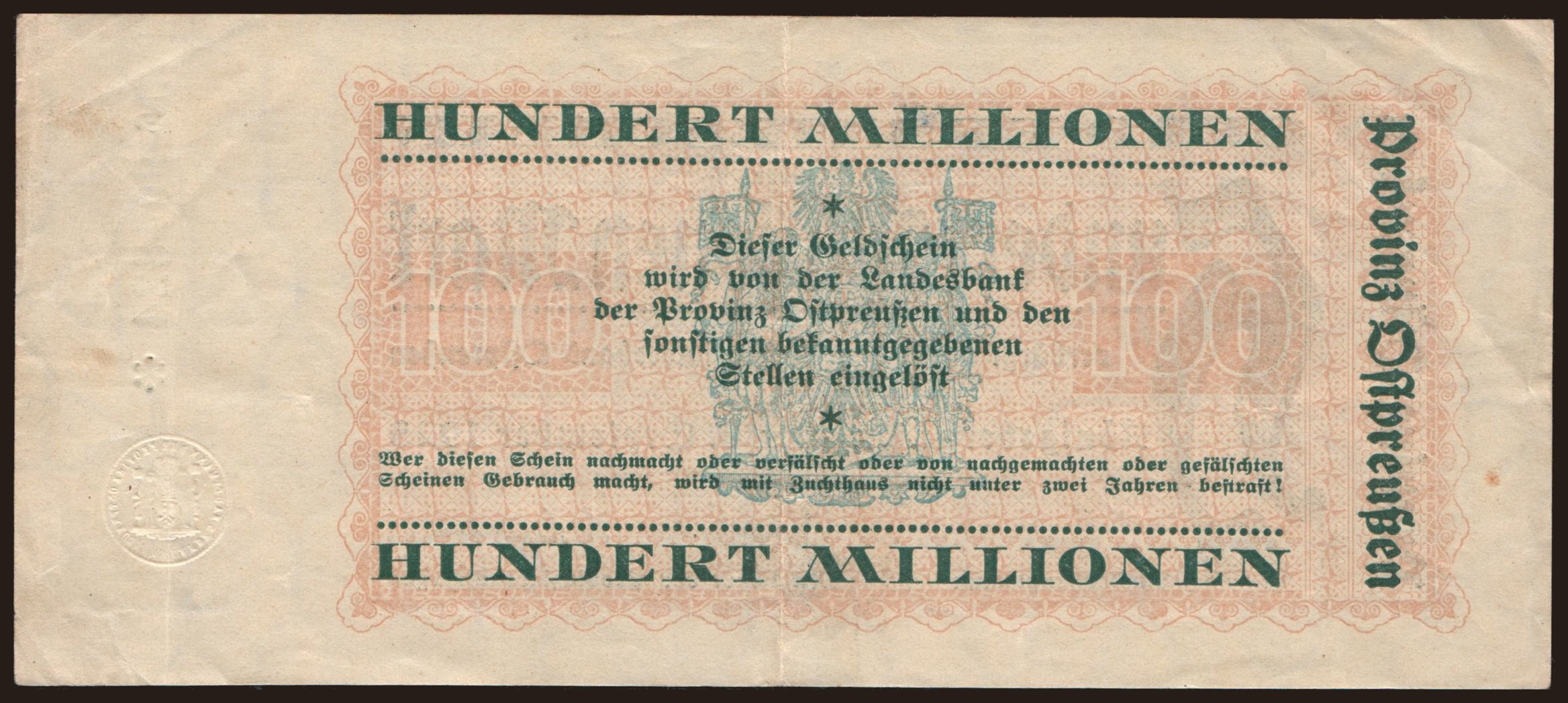 Königsberg/ Provinzialverband Ostpreussen, 100.000.000 Mark, 1923