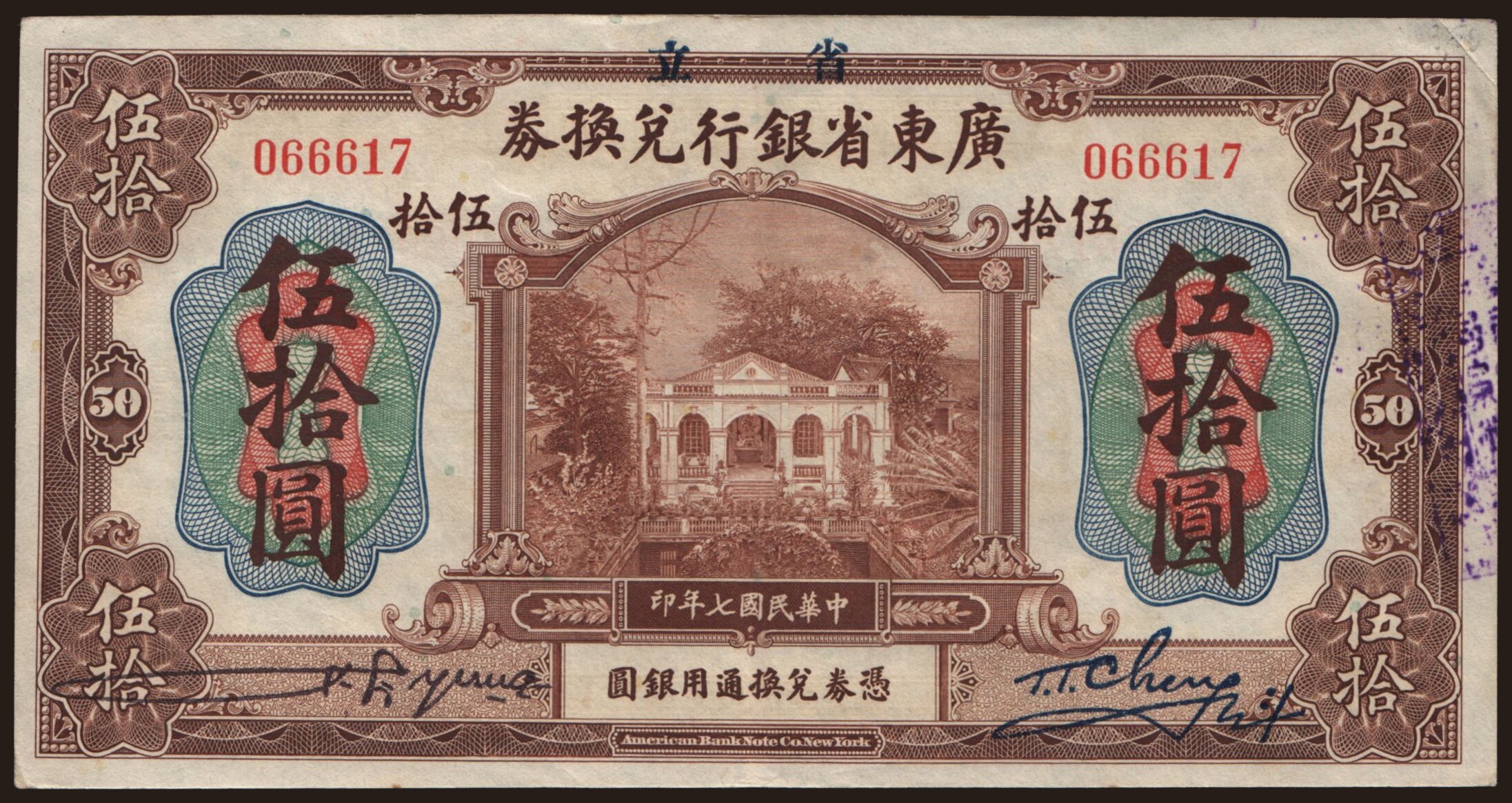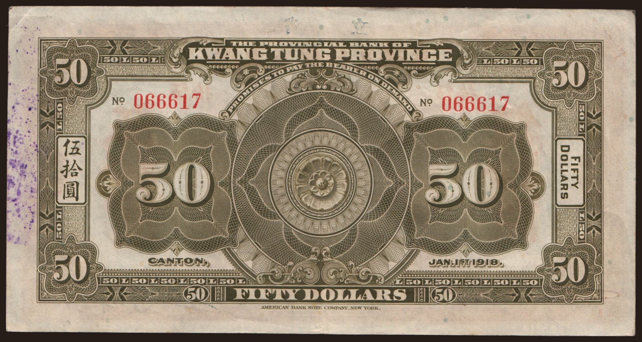 Kwangtung Provincial Bank, 50 dollars, 1918