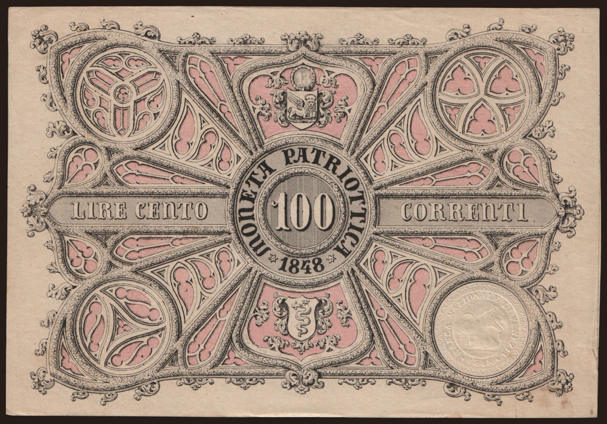 Moneta Patriottica, 100 lire, 1848