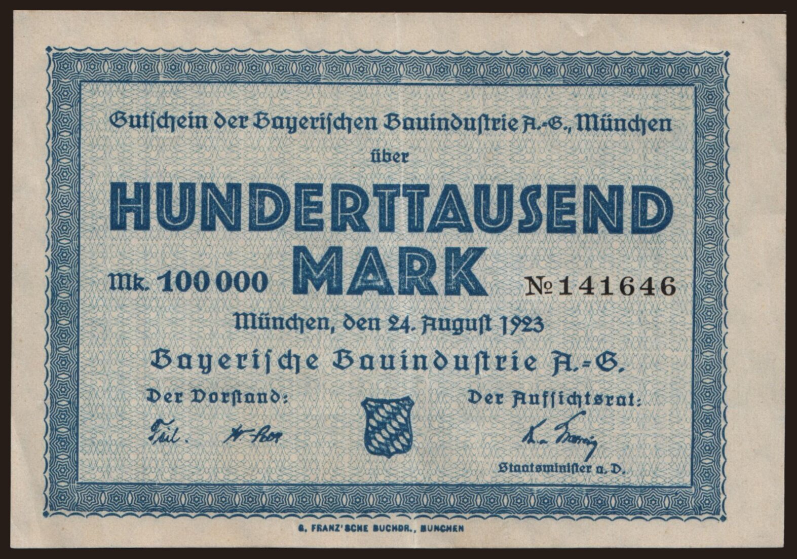 München/ Bayerische Bauindustrie A.G., 100.000 Mark, 1923