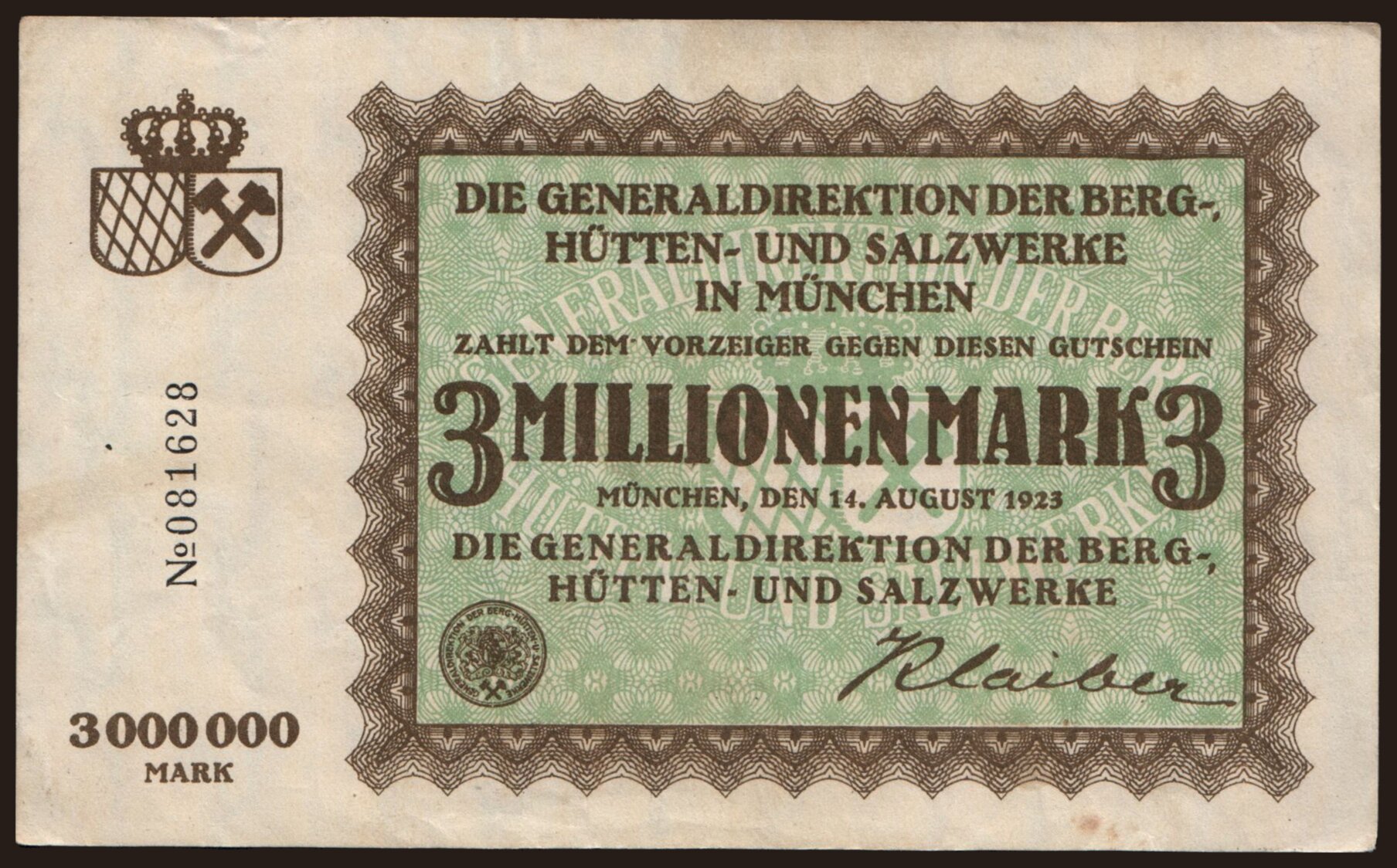 München/ Generaldirektion der Berg-, Hütten u. Salzwerke, 3.000.000 Mark, 1923