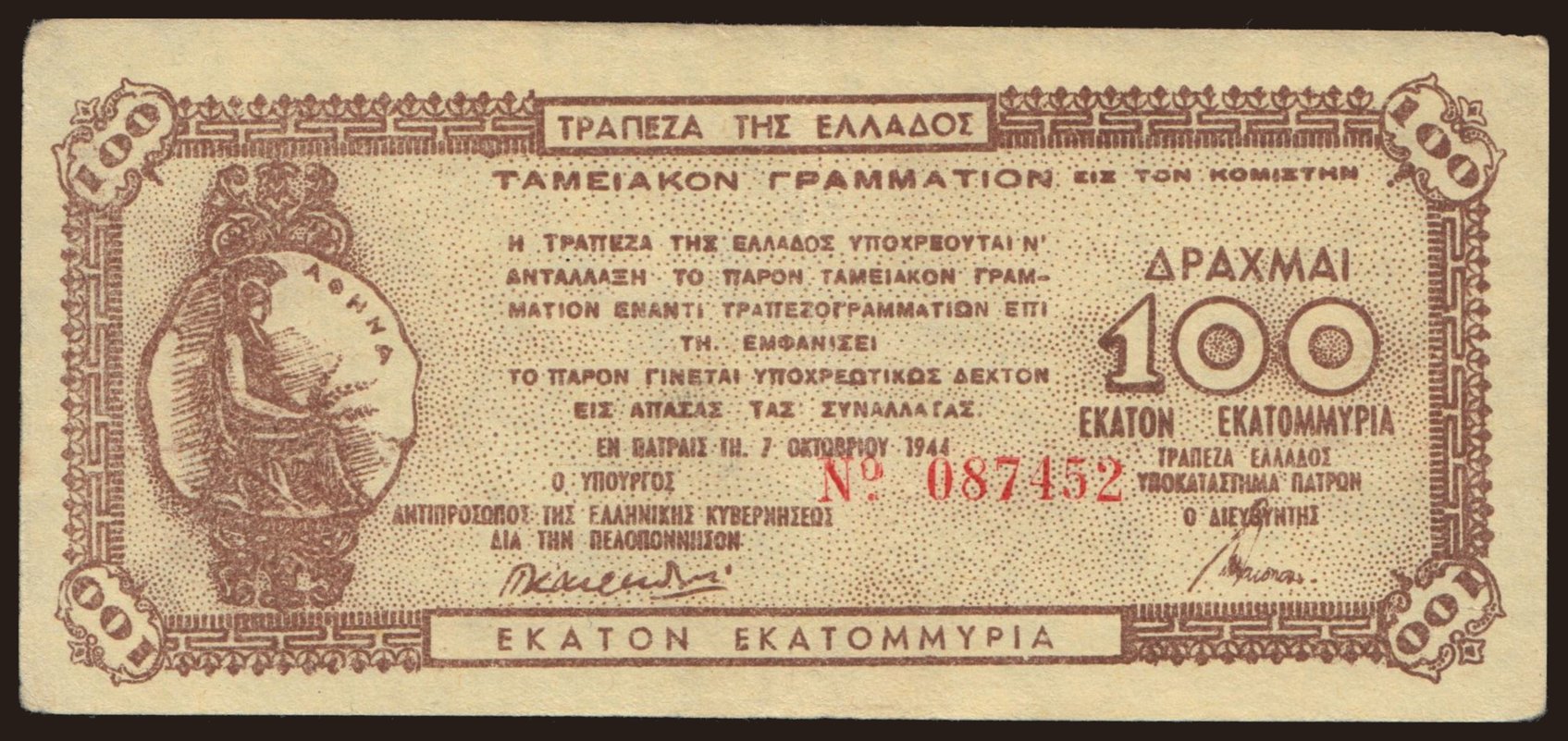 Patras, 100.000.000 drachmai, 1944