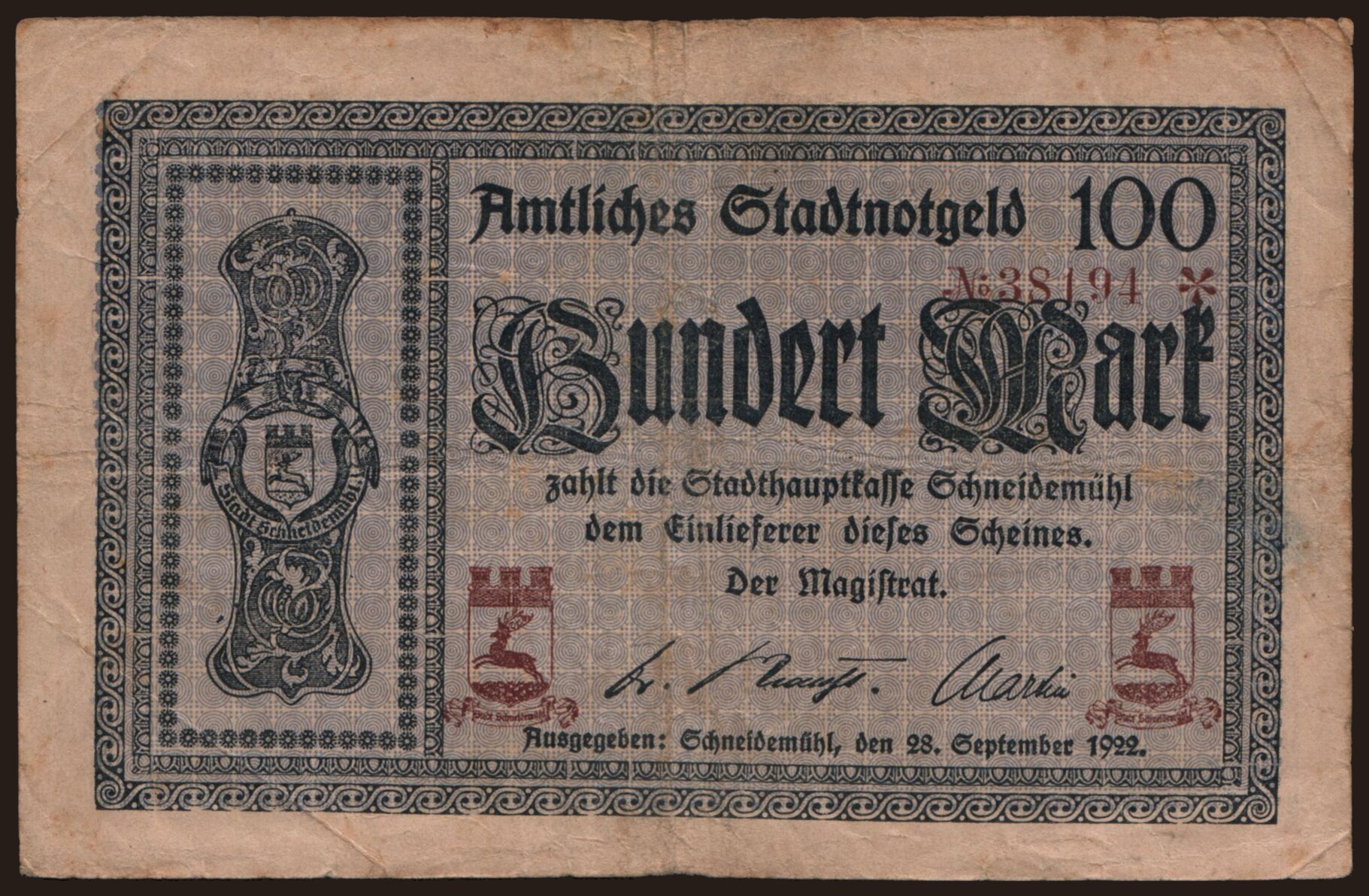 Schneidemühl/ Stadt, 100 Mark, 1922