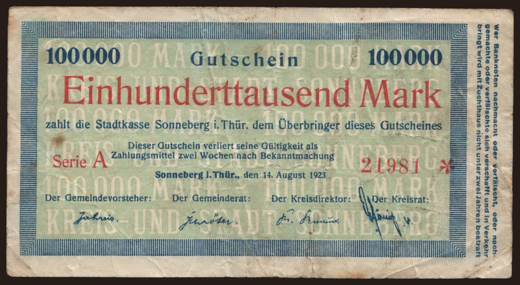Sonneberg/ Stadt und Kreis, 100.000 Mark, 1923